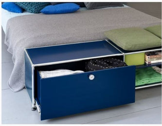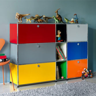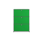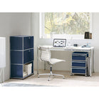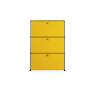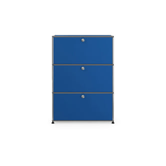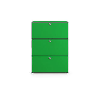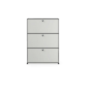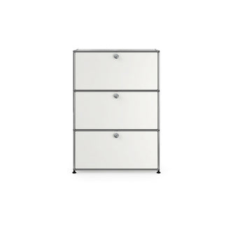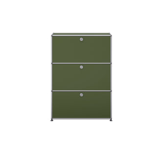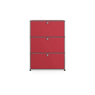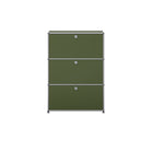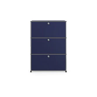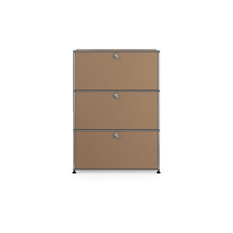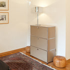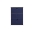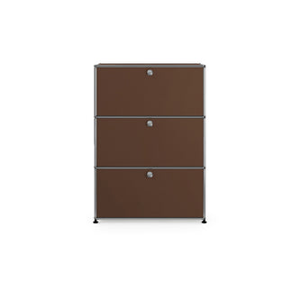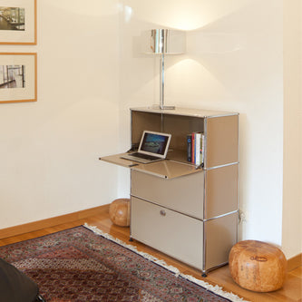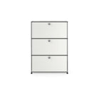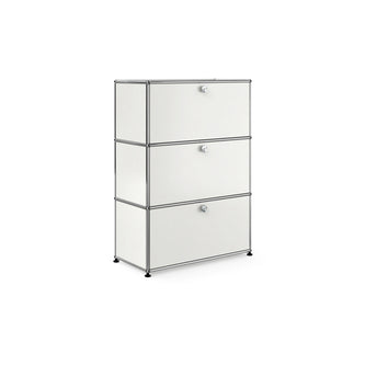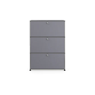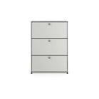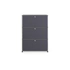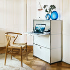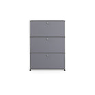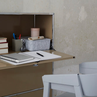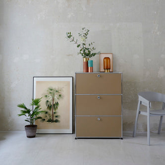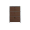 上段と中段にドロップダウンドア、最下段にエクステンションドアが付いた3段のキャビネット。一つの棚の内側は、A4ファイルを縦にしても横にしてもぴったり収納できる高さと奥行で、平置きでは3つ並べて置くことができる幅があります。最上段のドロップダウンドアを開けて、簡易デスクとしてもご使用いただけます。どんな場所でもご使⽤いただける定番ユニットです。