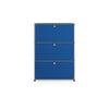 上段と中段にドロップダウンドア、最下段にエクステンションドアが付いた3段のキャビネット。一つの棚の内側は、A4ファイルを縦にしても横にしてもぴったり収納できる高さと奥行で、平置きでは3つ並べて置くことができる幅があります。最上段のドロップダウンドアを開けて、簡易デスクとしてもご使用いただけます。どんな場所でもご使⽤いただける定番ユニットです。