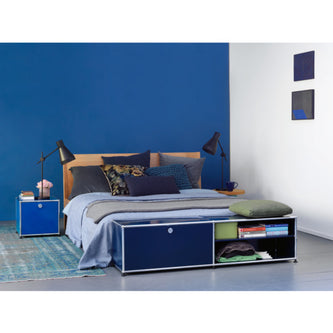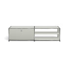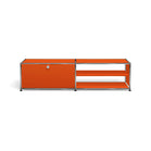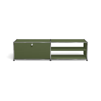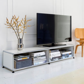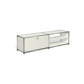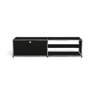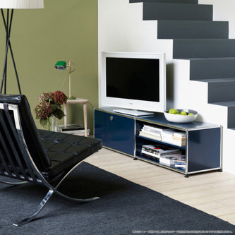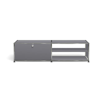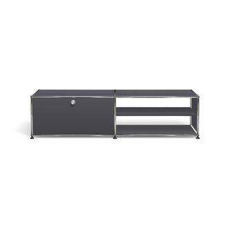 棚板部分にレコーダーなどが収納できます。バックパネルがないので配線も簡単。左側はドロップダウンドア。レコードも縦に収納が可能です。